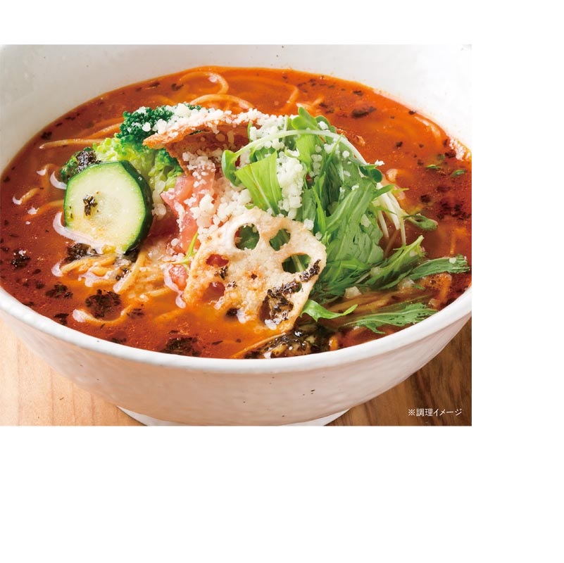 | 原材料名 | <麺> 小麦粉(国内製造)、発酵調味液、小麦たん白、卵白粉末、食塩、植物油脂/加工でん粉、ソルビット、かんすい、ぶどう糖多糖、クチナシ色素、(一部に卵・小麦・大豆を含む)、打粉(加工でん粉) <スープ> トマト(北海道産)、(国内製造)、トマトペースト、植物油脂、食塩、チキンエキス、果糖ぶどう糖液糖、しょうゆ、デミグラスソース、砂糖、ポークエキス、動物油脂、たまねぎ、にんにく、香辛料/調味料(アミノ酸等)、酒精、酸味料、増粘剤(グァーガム)、香辛料抽出物、(一部に小麦・卵・乳成分・牛肉・大豆・鶏肉・豚肉・ゼラチンを含む) |